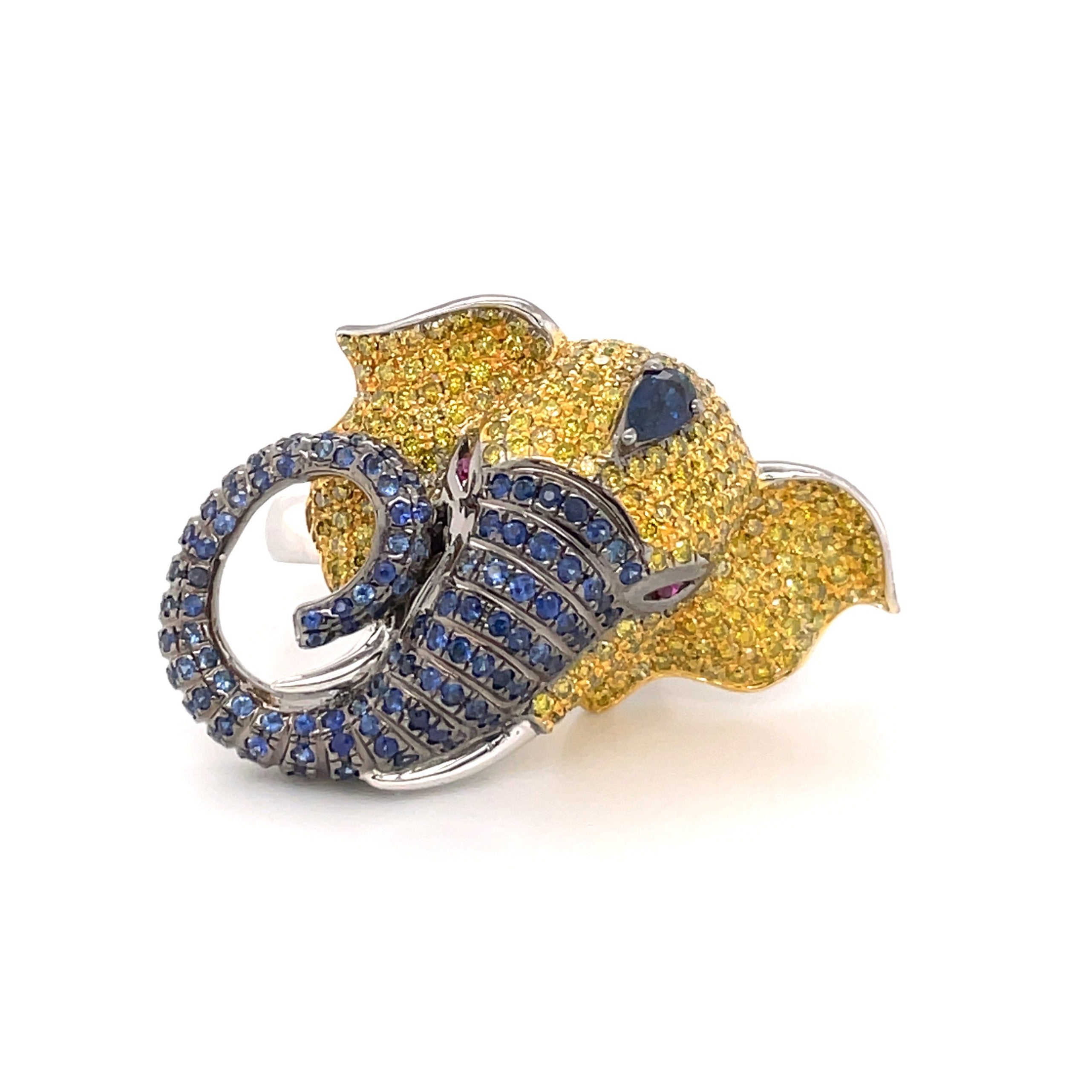Ruby Eyed Yellow Diamonds and Sapphire Elephant Head Ring