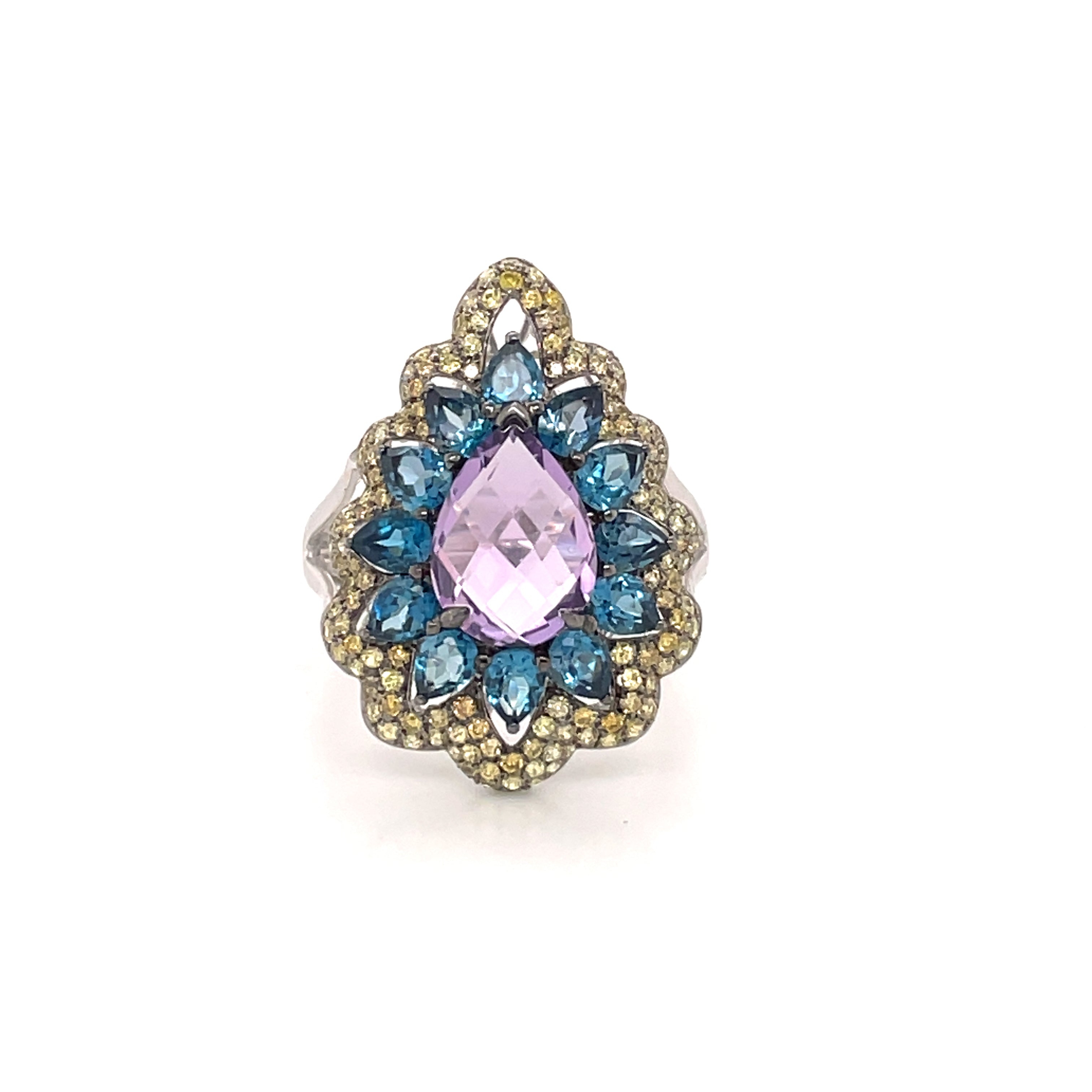 Amethyst London Blue Topaz and Fancy Colored Diamonds Teardrop Ring